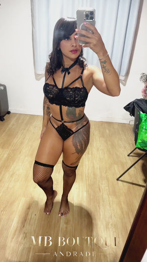 Lingerie com meia arrastãoFantasia Coelhinha de Luxo com Renda, Meia Arrastão, Pompom e tiara