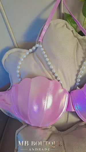 O Top Sereia Aurora é uma lingerie sensual feminina com design exclusivo em formato de concha, confeccionado em tecido rosa perolado com brilho suave e toque acetinado. Uma peça criada para mulheres que desejam surpreender com elegância, confiança e um toque de fantasia.