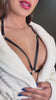 Desenvolvido com tiras ajustáveis em brilho suave e argolas metálicas, ele cria uma moldura charmosa no colo — perfeita para usar com blusas cavadas, transparências, camisas abertas ou vestidos com decote em V.
