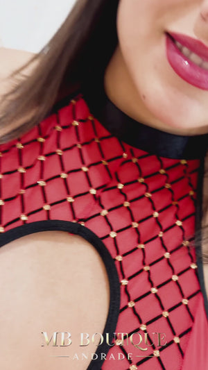 O Body Scarlet foi criado para mulheres que gostam de se destacar com elegância. Em vermelho vibrante com detalhes em tela e acabamento em preto, ele conta com um recorte frontal que valoriza o colo e alonga a silhueta. Acompanha luvas longas com acabamento franzido e um cinto preto com argola dourada – acessório removível que permite transformar o visual conforme a ocasião.