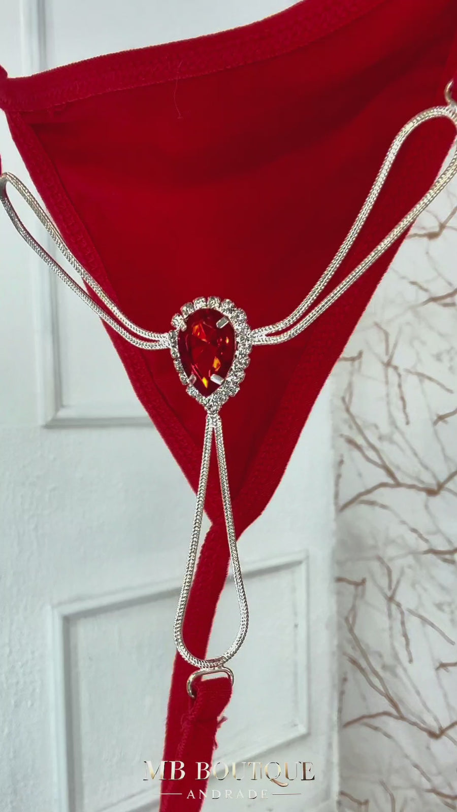 Design: Calcinha fio dental com pedra vermelha lapidada, strass aplicado e correntes metálicas decorativas