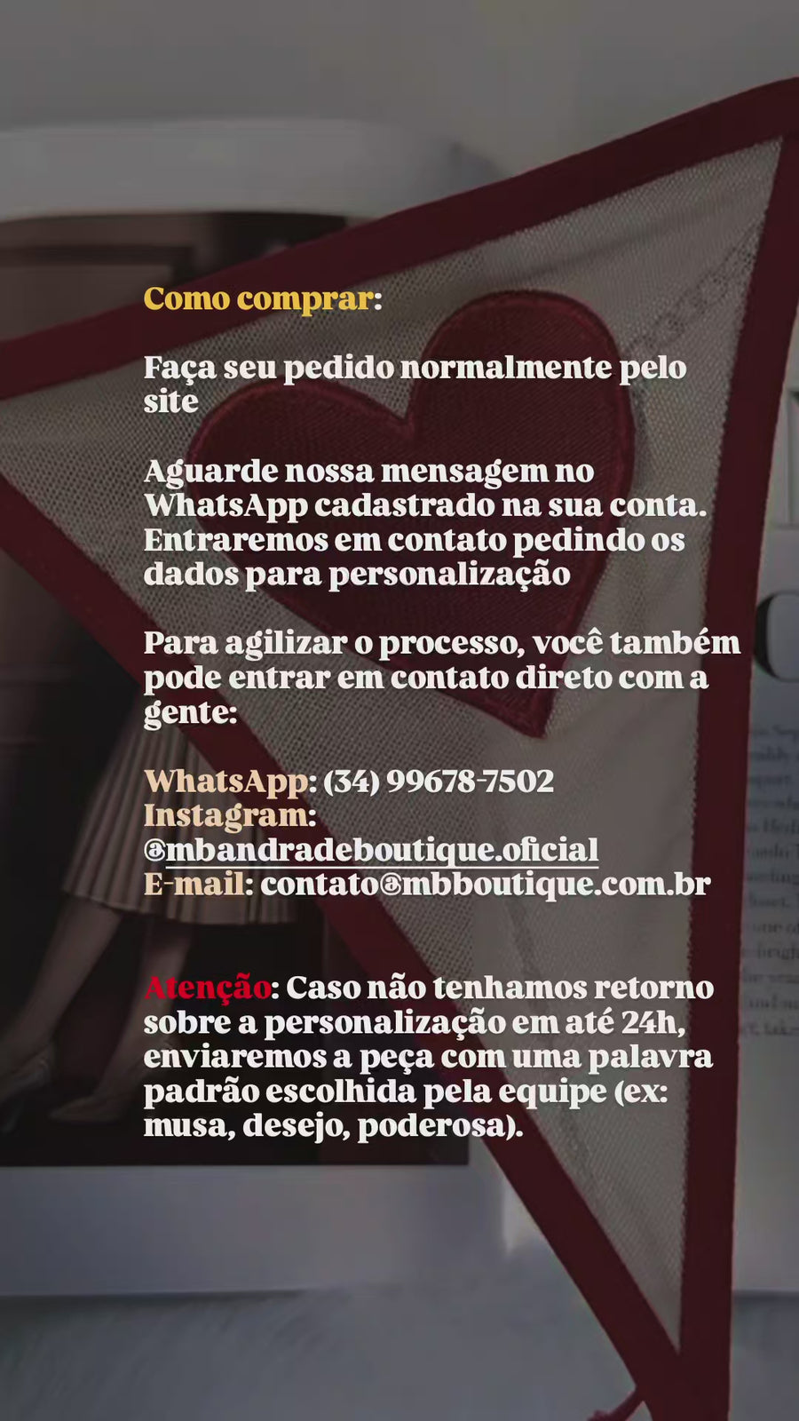 Uma peça inesquecível para momentos especiais. A Calcinha Personalizada com Corrente e Coração Bordado – Edição Especial foi criada para surpreender com charme, leveza e um toque de carinho.