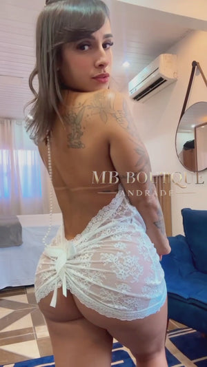 Para realçar o efeito, combine com um colar delicado que acompanhe o caminho das pérolas nas costas (traçando o mesmo visual de luxo) e um salto alto branco ou prata para alongar a silhueta. Use em um quarto com luz amarelada suave e velas aromáticas para intensificar a atmosfera de desejo e conexão.