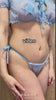 O top possui modelo ombro a ombro com elástico para ajuste, além de amarração frontal com laço de cetim, que permite adaptar ao corpo com charme. A calcinha fio acompanha o visual com laterais que se ajustam por amarração e acabamento franzido, ideal para diferentes tipos de quadril.