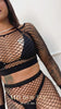 Design: Conjunto ajustado ao corpo, com manga longa e calça inteira em arrastão, criando um visual provocante e cheio de atitude