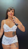 Parte frontal: Top decote em V delicado e shortinho confortável